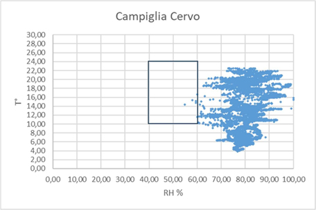 Per capire la portata del fenomeno si può fare una comparazione con i valori registrati in una cripta di una chiesa in provincia di Mantova (Asola) in cui anche lì si ha che per il 98% del tempo si è al di là del range, ma la media è pari al 75%, lo stesso vale per la chiesa di Predappio con il 97% di valori out ma con una UR media pari al 69%. Un solo caso, tra i 20 esaminati, ha una condizione peggiore di quella di Campiglia, ma è un ipogeo (Caivano) e quindi i dati sono più facilmente spiegabili: sforamento dai parametri del 100% e media di UR pari a 89%.